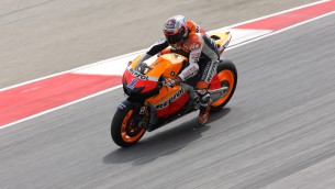 Andrea Dovizioso, Álvaro Bautista y Nicky Hayden se sitúan a continuación, con el norteamericano ya a 2.122s. del tiempo de Stoner. El debutante Stefan Bradl (LCR Honda) estuvo probando ayer dos geometría del chasis diferentes y esta mañana ha salidoa la pista de neuvo con ambas opciones para verificar sus impresiones. El alemán tenía planeado realizar una simulación de carrera pero el cansancio acumulado le invitará probablemente a desistir de esa intención y a acabar anticipadamente.